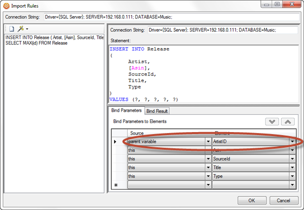 We are now done with the Artist query-node. Select the Release query node, open the Import Rules form and add your statements. The connection string is inherited from the import rules of the parent query element, i.e. from the Artist node. You can change the connection string if you wish. Click on the magic wand button and select New INSERT Statement. When inserting the releases for an artist we need to bind the Artist row id, which we bound to the variable ArtistID, to the Artist column in the import statement, see image 7 below.