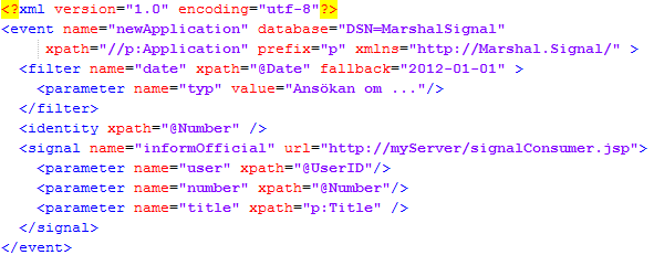 To define the signal message to be assembled and sent, a signal element is used. Two types of signals are supported: web or Marshal. A call to a web service means that an URL is constructed as specified by the signal element. The URL is then invoked using as an http-get-request. The other option means calling Marshal Archiver to run a job with parameter set according to the signal element.